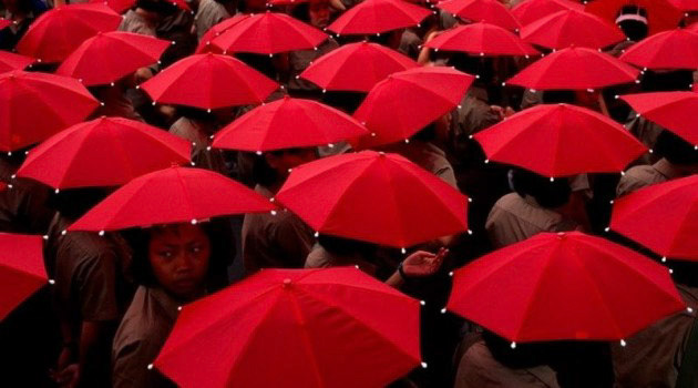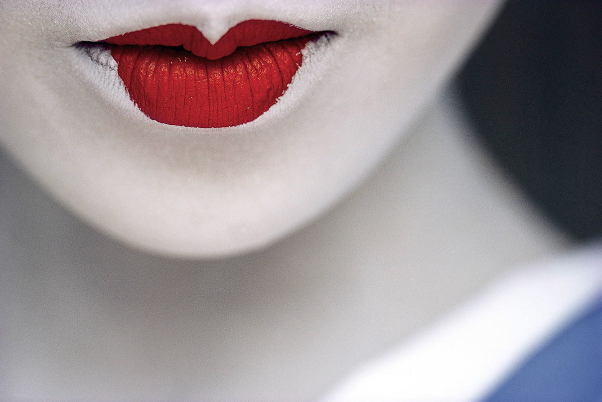 INDIA-10209NF, Boy participating in the festival of Ganesh Chaturthi is covered with red powder during the exuberant celebration. This festival marks the birthday of Lord Ganesh. Ganesh, or Ganpati as he is sometimes called, is one of the most popular deities in the region. He is worshiped by both Shaivites and Vaishnavites. Even Buddhists and Jains have respect for Ganesh. He is considered to be an avatar of both Shiva and Vishnu., Mumbai (Bombay), India, 1996In the midst of the festival of Ganesh in Bombay, as people young and old processed from their neighborhoods to the sea, McCurry interrupted a youngster with a request to make his picture. The boy consented, and one reads in his eyes the vulnerability of his acceptance. We see a fragment of festive time, a stilled moment extracted from a noisy, exuberant parade. Yet the boy, framed on the one side by three aggressive slashes of red upon the light face of a pillar; the shadow form of another person at his other side; and the central anchor of his intensely questioning eyes. -Anthony Bannon